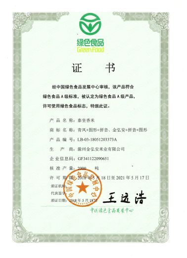 青鳳牌泰皇香米綠色食品證書